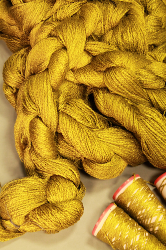 Strādājam arī ar Latvijas zinātnieku izgudroto unikālo dzintara diegu, rokām vērptiem zīda pavedieniem un pienā mērcētu buklē.